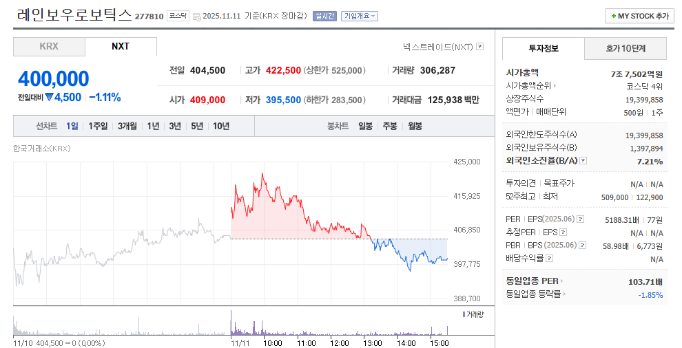 2025년 11월 11일 기준, 레인보우로보틱스의 주가는 40만 원 수준입니다. 이미 삼성전자 지분 인수 기대감이 주가에 충분히 반영된 상태이며, 현재 시가총액은 약 7조 5천억 원에 달합니다. 이익이 아직 본격적으로 발생하지 않은 기업으로서는 상당히 높은 평가를 받고 있는 셈입니다. 따라서 단기 투자 관점에서는 부담스러운 구간이며, 지금 시점에서 진입하기보다는 조정이 왔을 때 ‘분할 매수’ 혹은 ‘관망’이 더 현명한 선택으로 보입니다.