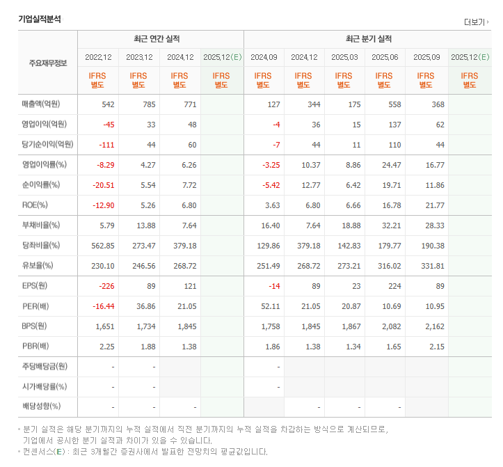 - **고평가 부담 (PBR 2.48배):** PBR(주가순자산비율)이 **2.48배**라는 것은, 회사의 순자산 가치보다 주식 가격이 약 2.5배 높게 형성되어 있다는 뜻입니다. 이는 현재의 실적보다는 **미래의 성장 기대감을 주가가 이미 크게 앞서 반영**하고 있음을 의미합니다.