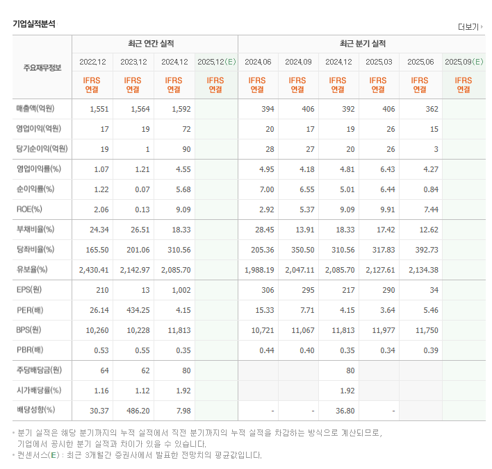 - 2. 저평가 매력 — PER 4배, PBR 0.3배는 전자부품 업종 평균보다 현저히 낮아, 가치주 관점에서 관심을 가질 만합니다.