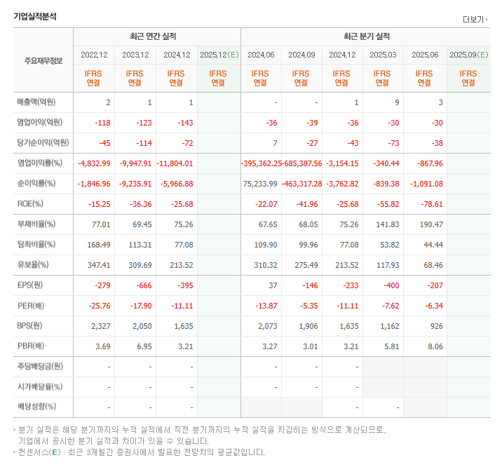 기업의 매력과 별개로, 재무 상태는 여전히 불안정합니다. 2022년부터 2024년까지의 매출은 연간 1~2억 원 수준으로 거의 변화가 없으며, 영업이익은 2022년 -118억 원, 2023년 -123억 원, 올해도 -143억 원으로 3년 연속 적자입니다. 순이익 역시 마이너스 70억 원대에서 개선되지 않았습니다. 즉, 기술력은 높지만 아직 ‘돈을 버는 구조’로는 자리 잡지 못한 상태입니다. 이런 기업의 주가가 급등할 때는 항상 ‘기대감만으로 움직이는 구간’일 가능성이 높습니다. 실제 실적이 뒷받침되지 않으면, 테마가 식는 순간 급락이 찾아올 수 있습니다.
