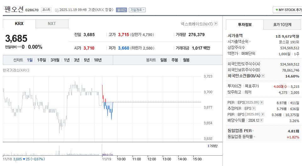 팬오션의 주가는 최근 3,600원대에서 움직이고 있으며, 시가총액은 1조 9천억 원 수준으로 중형 해운주에 속합니다. 52주 고가는 4,375원, 저가는 3,054원으로, 현재가는 저점 대비 어느 정도 반등한 위치지만 여전히 밸류에이션 매력은 유효한 구간에 위치해 있습니다.