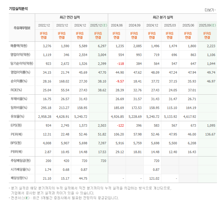 부채비율은 약 30% 이하로 안정적이며, 유보율은 4,000% 이상으로 재무적으로 매우 견고합니다. PER(주가수익비율)은 약 51배 수준으로 다소 높게 형성되어 있지만, 이는 AI 관련 기대감이 반영된 결과로 해석됩니다. ROE(자기자본이익률)는 38%를 웃도는 수준으로, 수익성 지표가 매우 우수합니다.